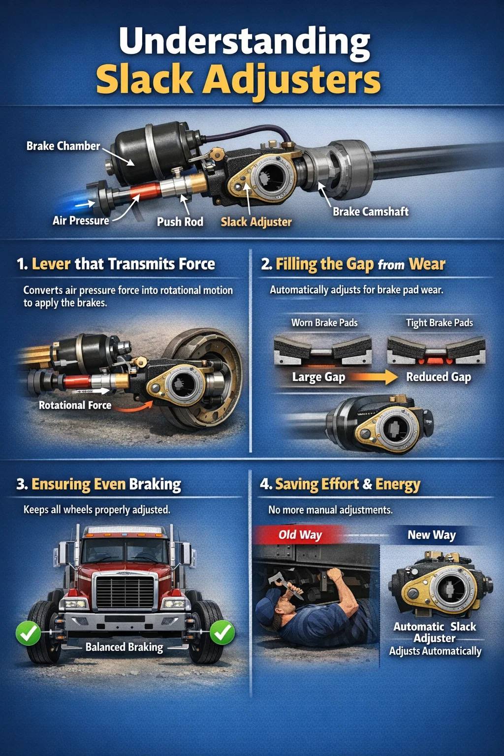 Stejně jako páka převádí lineární sílu ze vzduchové komory na rotační sílu, která pohání vačkový hřídel brzdy k otáčení.